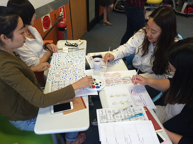 随后10:30的英语课上,fady老师介绍了澳洲原住民的风土人情,以及他们原始的交流方式—图腾。老师向我们展示了各类图腾代表的含义,以及组合起来所描述的事件,然后准备了颜料让我们分成小组各自创作(图5)。之后老师用吉他伴奏唱歌的形式,教了我们英语口语发音中连续、重音、语音语调等技巧,同学老师们十分欢乐,课堂气氛活跃。