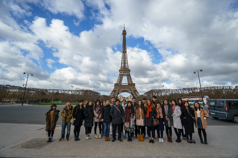 上午11点50分,访学团结束了拉维莱特公园之行,并在马林老师的带领下前往埃菲尔铁塔。不同于前两日的阴雨连绵,今日的巴黎难得的露出了蓝天,访学团成员均对此感到兴奋不已,见此情状,马林老师便示意访学团成员在埃菲尔铁塔前合影留恋,以此为巴黎之行划上一个圆满的句号。