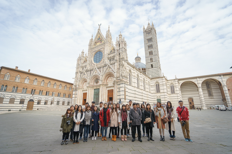 午时11点15分,访学团一行经锡耶纳卡加纳音乐学院,前往锡耶纳大教堂进行参观。穿行在锡耶纳的街巷,马林老师向访学团介绍了锡耶纳大教堂的历史。他表示:“锡耶纳大教堂时意大利最大的教堂之一,是始建于1136年的哥特式建筑。教堂内藏有诸多珍宝,而尼古拉·皮萨诺及米开朗基罗的雕塑作品亦藏于其中。”语毕,访学团成员均对该教堂有了初步的了解。行至锡耶纳大教堂的门前,马林老师便携访学团成员在此一同观赏教堂的外部构造,并邀访学团在此合影留念。