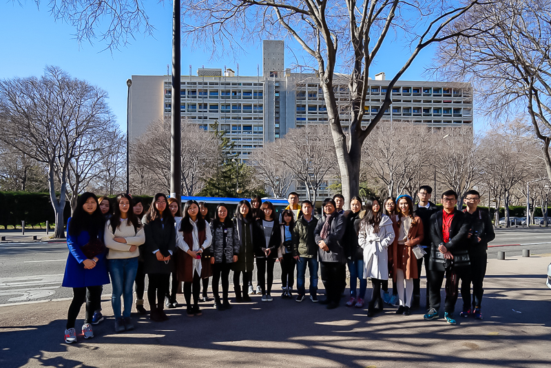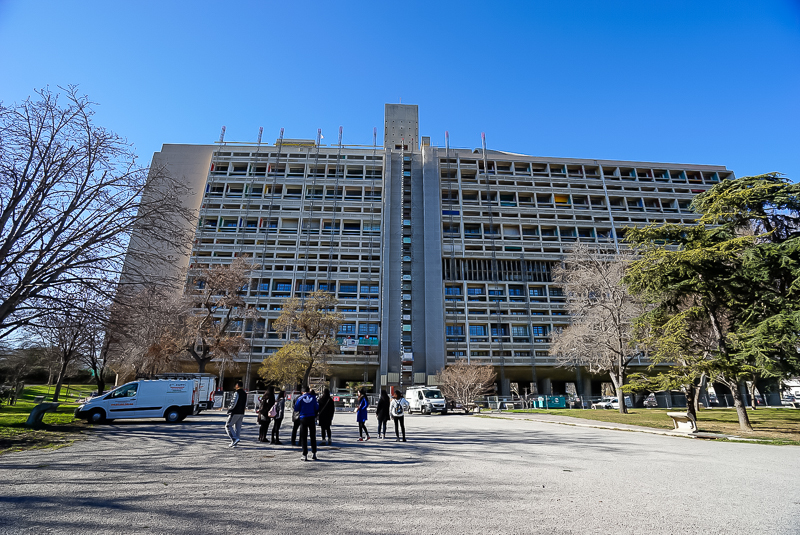 中午十二时整,访学团到达马赛老港口。稍作停留,便驱车经由普拉托大道抵达马赛公寓。马赛公寓大楼,是现代主义大师勒·柯布西耶的代表作之一,于1952年建成。但由于公寓施工,访学团无法进入公寓内部进行参观,随行老师便为访学团作了简要介绍:“二战结束后,法国政府亟需缓解战后欧洲房屋紧缺的状况,,便请来柯布西耶设计了新型的密集型住宅——马赛公寓,马赛公寓的设计将住宅群与城市联系在一起,大楼公有18层,地面层是敞开的柱墩,上面有17层,其中1-6层和9-17层是居住层,可住337户1600人;7、8层是商店和公用设施,商店和公用设施,包括面包房,副食品店,餐馆,酒店,药房,洗衣房,理发室,邮电所和旅馆,满足居民的各种需求。顶层设有幼儿园和托儿所,通过坡道可到达屋顶花园。在半个世纪以前,它像一座方便的‘小城’一样,满足居民的各种生活需求,设计者利用底层架空与地面上的城市绿化及公共活动场所相融,让居民尽可能接触社会,接触自然,增进居民之间的相互交往。这在当时是具有开创性的。”