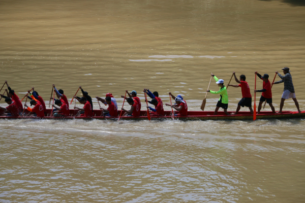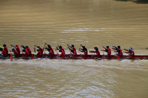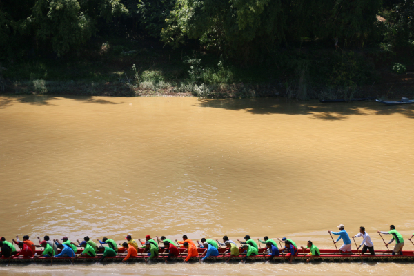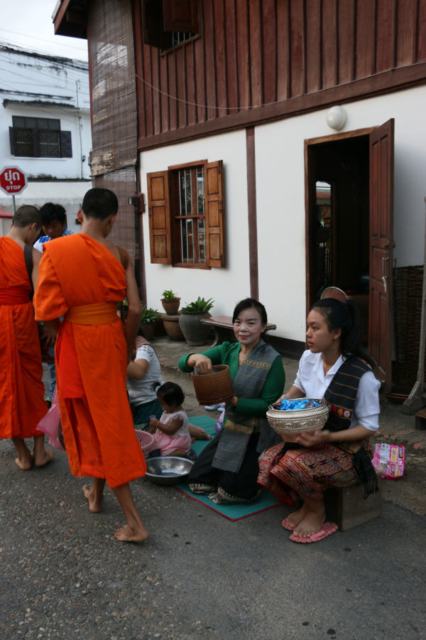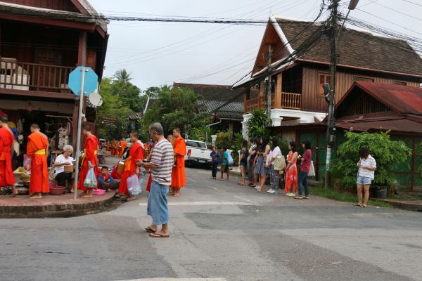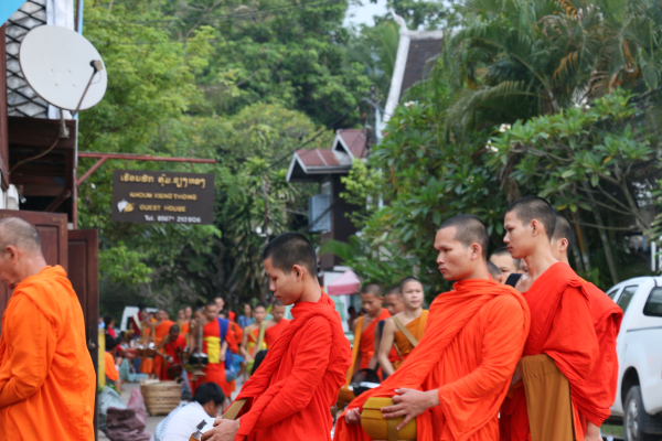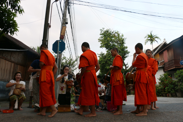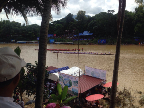 九月十二日是划船节第二天,天蒙蒙亮时就能感觉到节日的气氛越来越浓郁,店老板一家人有条不紊地安排布施的食物,食物比平时多出了很多糖果。男男女女衣着华丽,神情庄重,自然、安静的来到自家屋前,铺上毯子静静的等待前来布施的和尚。南湄公河岸商家将商棚搭了一路一眼望不到头。渐渐的完成布施的人们涌入河岸街道,音乐开始大声的播放,一艘艘龙舟划入河中,节日的高潮来了…今天的琅勃拉邦人最开心和放松,到处都在欢聚,到处都是歌声直到夜里。