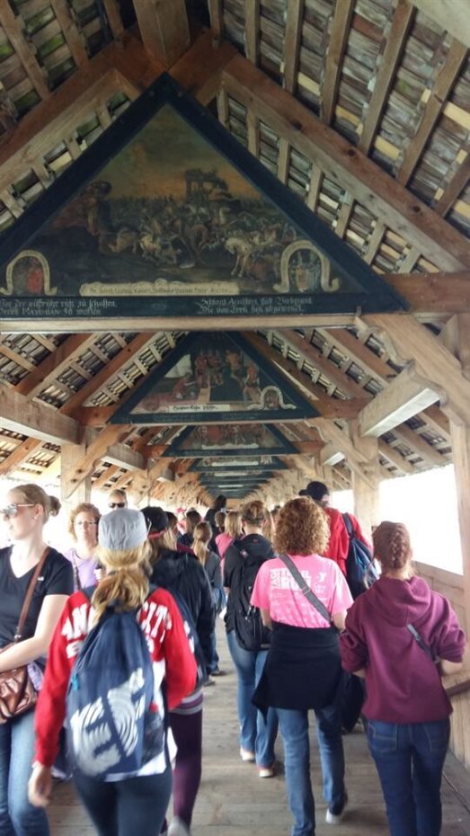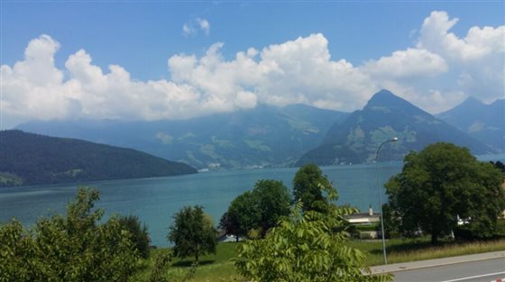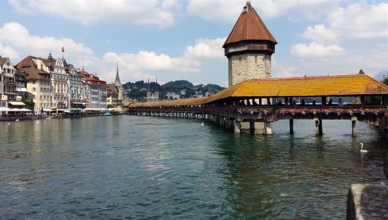 当地时间6月17日,当代艺术系教师离开米兰,赴瑞士,前去参观巴塞尔艺术博览会。路经卢塞恩(Luzern流森)湖,蓝天,白云,碧水,自然风光美不胜收。卢塞恩市内一座建于十五世纪的木质老桥蜿蜒曲折,桥顶壁画栩栩如生,游人如织。夜宿卢塞恩郊区村庄。