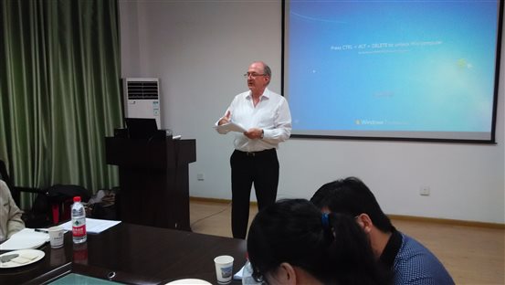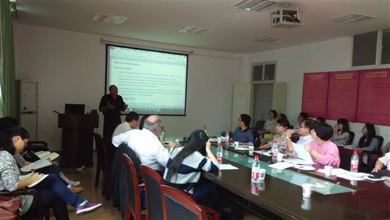 新闻传播学教师尚媛媛就如何对美国新闻传播学的学生教授“媒体伦理”课程,汪潇博士就在不同的大学里传播学的课程设置等问题进行了咨询。David Lux教授与同行的国际著名传播学者Stanley Baran教授对她们的问题进行了解答。