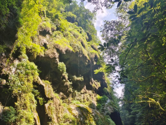 入眼是一片苍翠欲滴的连绵山脉,仔细一看是生机勃发的树木翠石,花草昆虫。峡谷有许许多多望不到头的阶梯,同学们拿起相机,摁下快门,在一声声惊叹之中开始了今日的旅程。