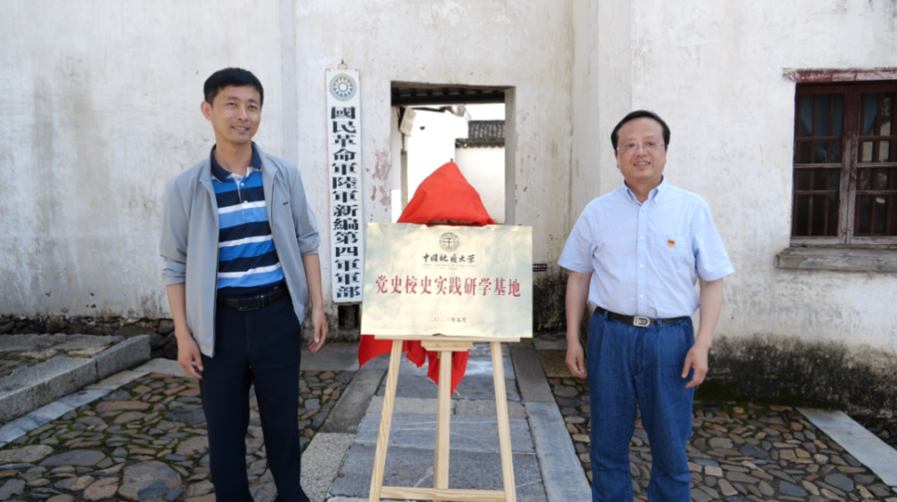 党史校史实践研学基地”的签约仪式和揭牌仪式。在签约仪式上,馆长洪帮介绍了纪念馆的基本概况及取得的成绩,表达了对学校及其辉煌历史的由衷崇敬,对我校“六组联学”结合党史校史教育、深入当地开展主题教育实践研学活动的真诚赞赏、热烈欢迎和诚挚谢意,并表示将大力支持基地建设。他希望学校将来利用节假日、重大纪念日等时间,组织师生到基地开展党史校史实践研学活动,接受红色教育,把新四军军部旧址纪念馆作为地大党史校史实践研学、宣传教育和思想政治教育的重要阵地。学校党委组织部长陈文武谈到,基地的建立将丰富我校党史校史研究与教育资源,要积极为引导本单位职工自觉运用唯物史观武装头脑、提升境界、推动工作发挥作用,为强化我校师生学习研究、宣传赓续党史校史的积极性和实践性作出贡献。她希望馆校双方共同建设好基地,“六组联学”充分发挥基地的作用,深入开展实践研学,提升研学实效。