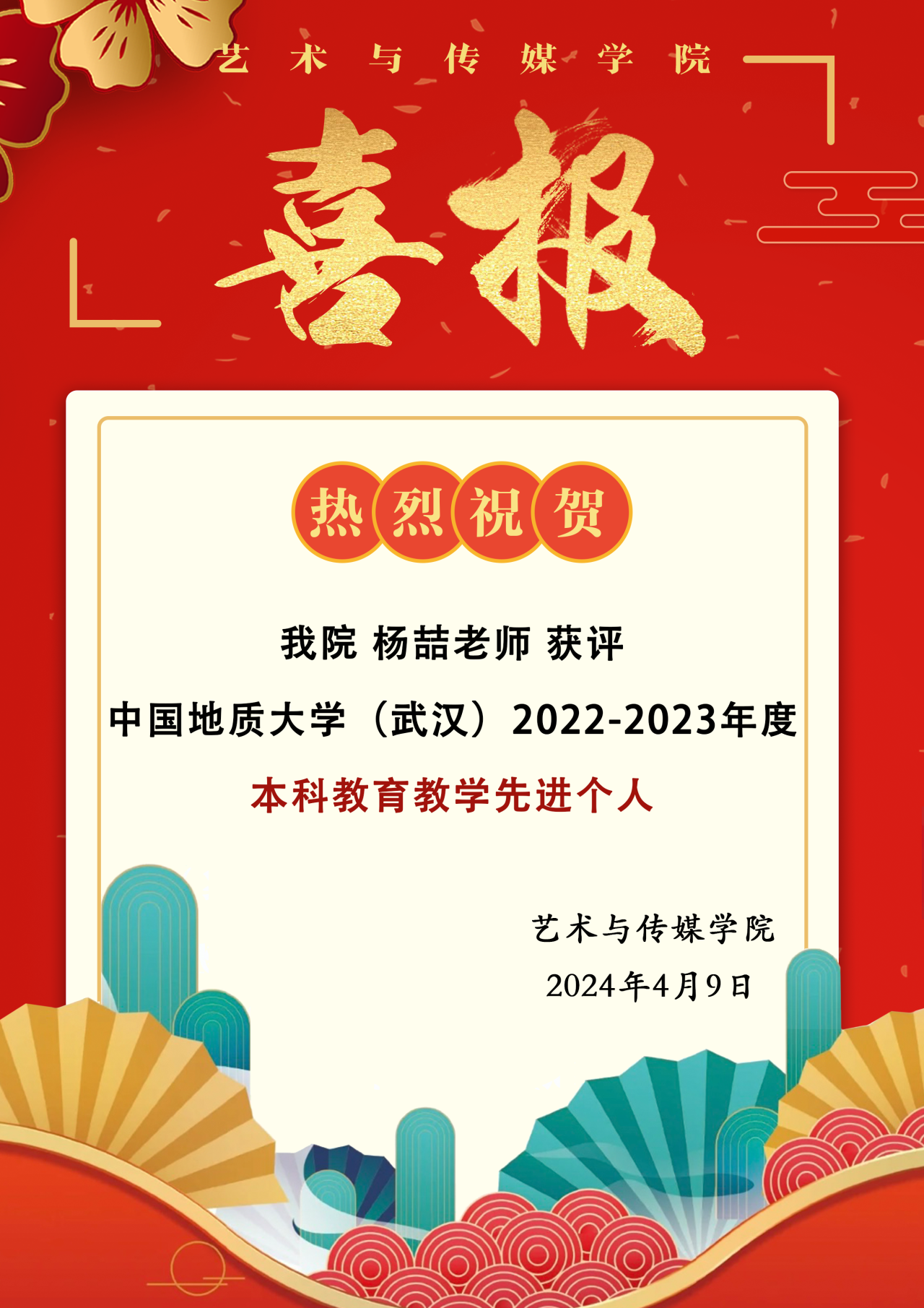 喜报|热烈祝贺亚洲色吧 杨喆老师获评学校2022-2023年度本科教育教学先进个人!
