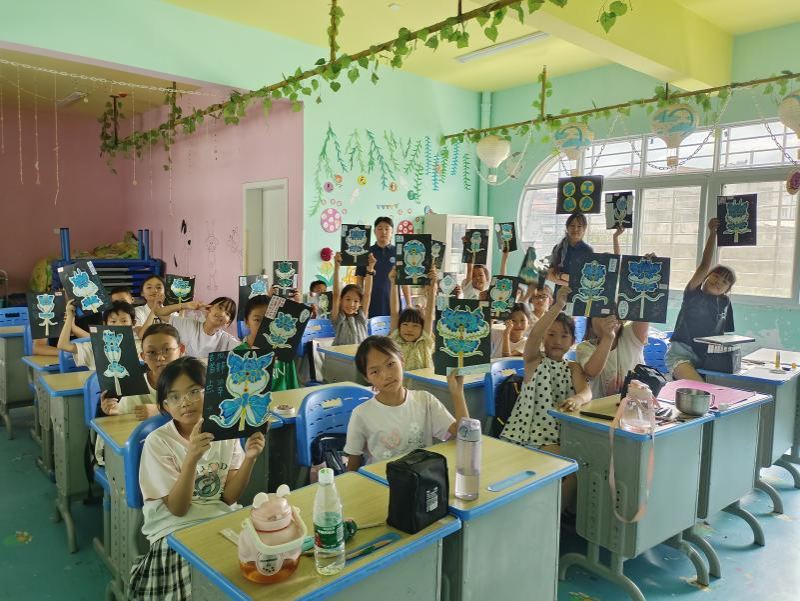 在授课过程中,支教团成员结合中国优秀传统文化,将艺术之美、中华文化之美融会贯通,用艺术教育培养孩子们对于美的认知和对中华文化的认同。充分发挥以史育人、以文化人的作用,让学生在学习过程中感悟信仰的力量,坚定理想信念。非遗皮影绘画、非遗点翠绘画、中国乐器解析鉴赏、扎染等课程,让同学们在美育中体悟传统文化深刻的内涵与持久的魅力,在艺术的世界里尽情遨游,在艺术中创造未来。