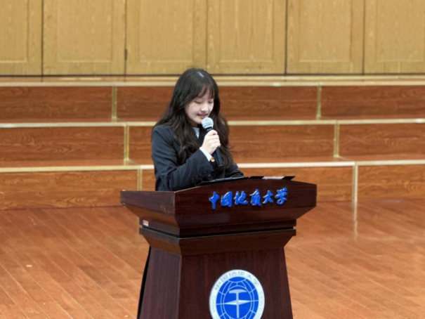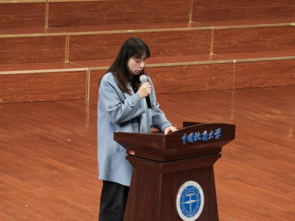 第五项,学院学生会主席金煦婷作为学院代表发表讲话。她提到,作为团学骨干,要凝聚青春力量,共同构筑团学梦想,做到信念坚定、政治过硬、能力突出、作风优良。随后,学院党委书记晋曦为“弘艺班”授旗。