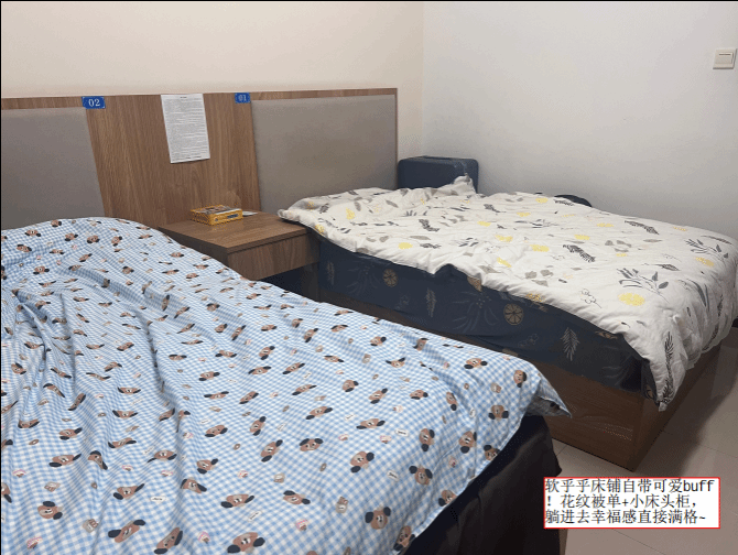 学习从来不是孤独的跋涉。在悦宾楼6217,我们看到了一幅 “学伴同行”的温馨画面:桌上并排摆放的两台电脑,常常同步播放着网课,室友们并肩而坐,随时交流、答疑解惑,让艰难的知识点在与同伴的讨论中变得清晰。而在床铺区,柔软舒适的床品自带“可爱buff”,花纹被单与贴心的小床头柜营造出放松的休憩氛围。尤为用心的是,床头贴着一张清晰的日程表,时刻提醒着学习进度。在这里,高效的学习协作与高质量的睡眠休息得到了完美平衡,躺下是满格的幸福感,起身是充沛的学习力。