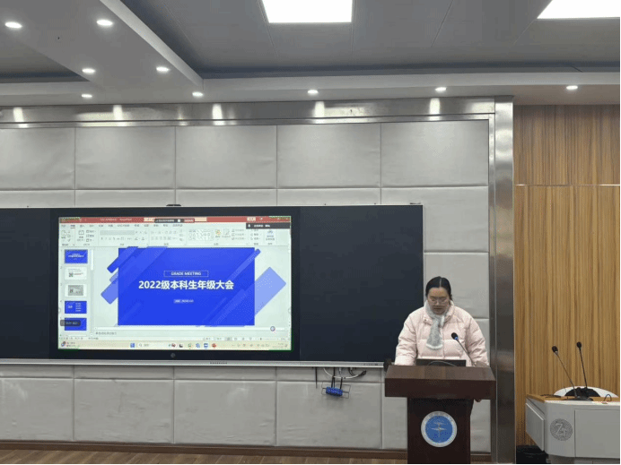 2022级本科生年级大会在1114报告厅召开。本次大会由专职辅导员曾戈晖主持,兼职辅导员黄灿及全体2022级本科生通过线上与线下相结合的方式参加会议。会议围绕学期总结、毕业、实习就业、安全教育展开。