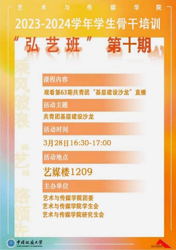 为深入贯彻落实习近平总书记关于共青团在学生思想政治工作中发挥主力军作用的重要要求,提高同学们的爱祖国意识,增强党性修养,3月28日,亚洲色吧 学生骨干培训“弘艺班”第十期在1209会议室顺利进行,学生会、研究生会学生骨干在团委书记单湉艺老师的带领下集体学习观看第63期共青团“基层建设沙龙”直播与“学党史爱祖国教育”线上公益大讲堂。