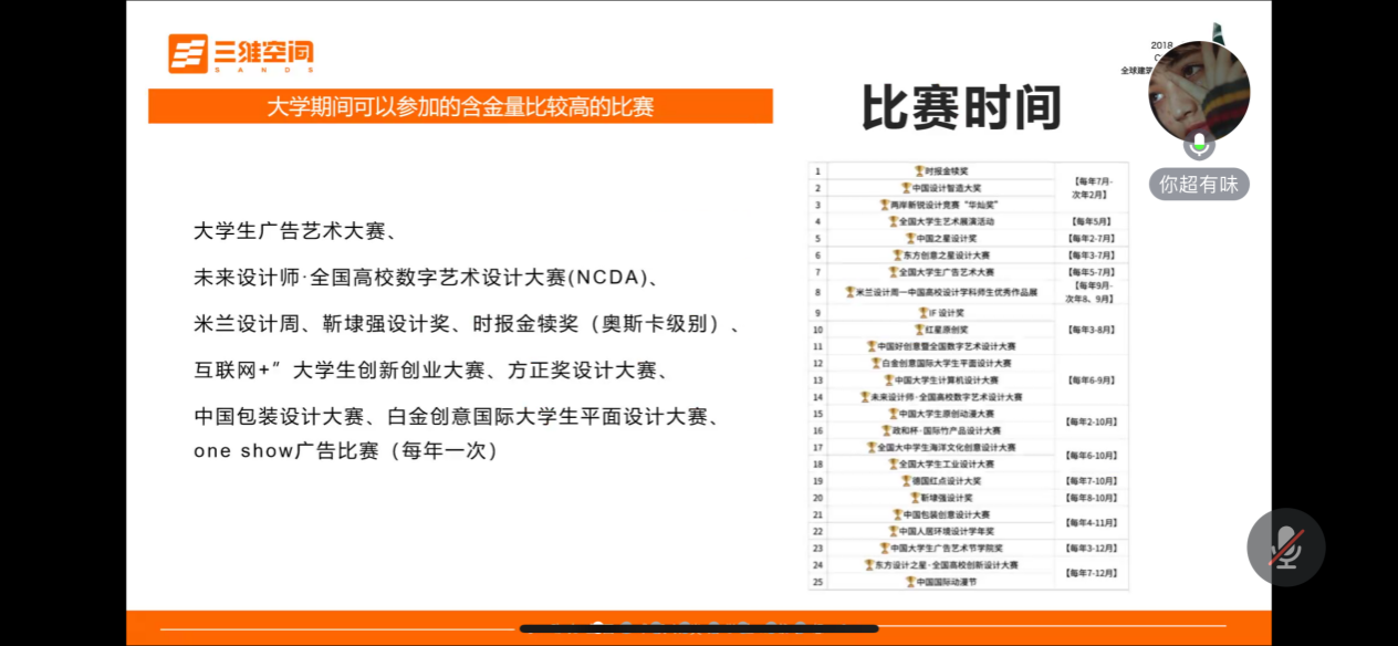 其次,老师向同学们分享了同学们在大学期间可以参加的含金量比较高的比赛及参赛时间,包括大学生广告艺术大赛、米兰设计周、未来设计师·全国高校数字艺术设计大赛等,鼓励同学们积极报名参赛。