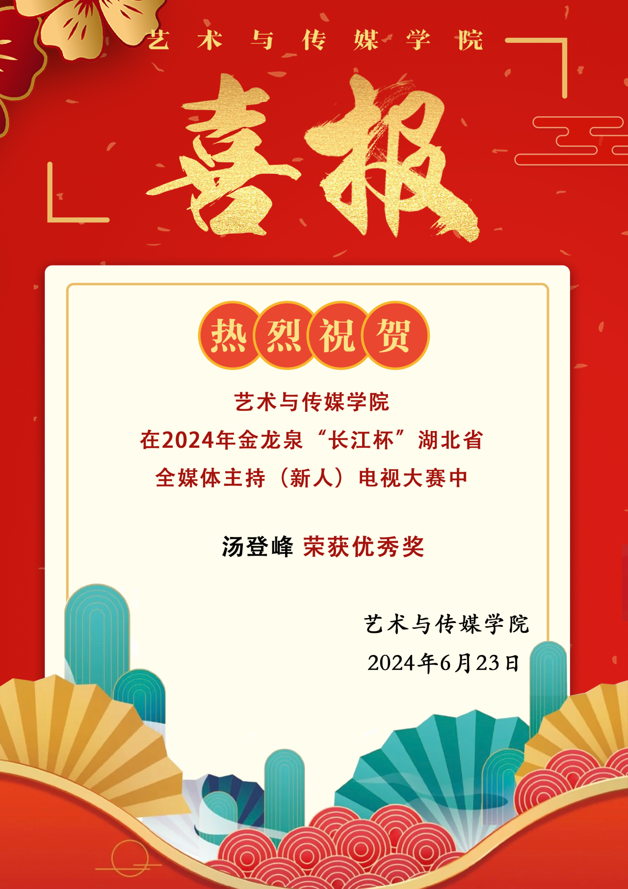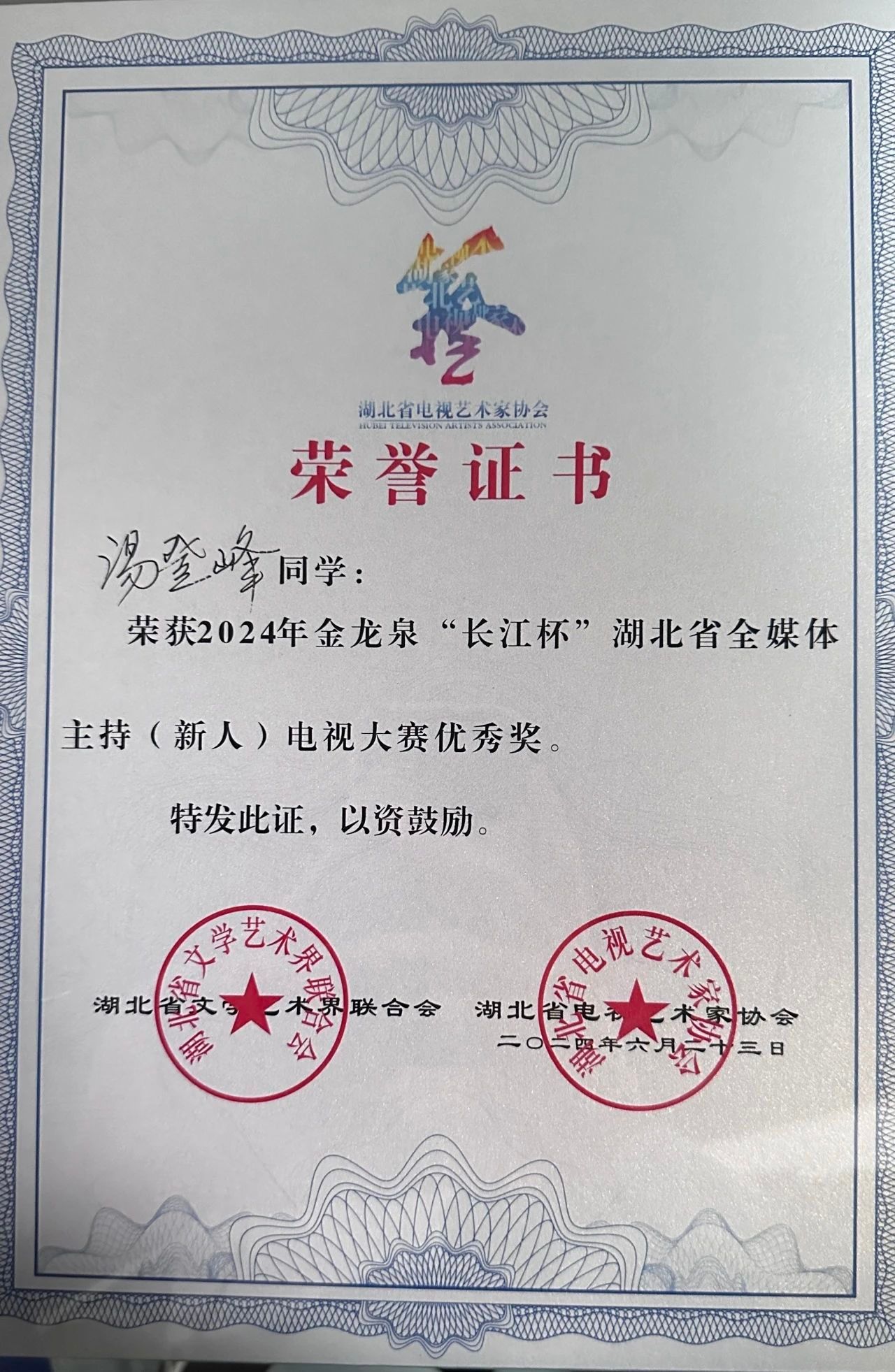 喜报!亚洲色吧 汤登峰同学在2024年金龙泉“长江杯”湖北省全媒体主持(新人)电视大赛中荣获优秀奖!