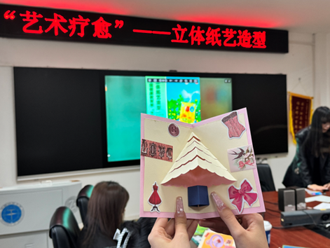 本次活动创新性地将心理育人和学科特色相结合,通过艺术疗愈过程中联动视觉、听觉、触觉等多重感官体验,帮助参与者实现更全面、更深层次的舒缓与释放。活动过程中,带领人刘燕晓、祖予希首先向大家介绍了立体贺卡制作的注意事项,随后各小组助教闫宇轮、曹慧娴、李怡雯详细讲解了制作流程,耐心解答同学们的疑问,并鼓励大家充分发挥想象力,创作独一无二的艺术作品。