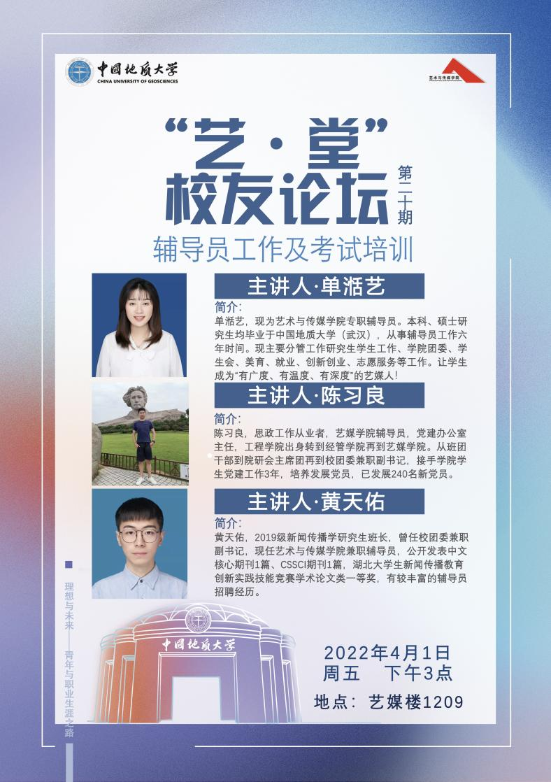召开第20期“艺·堂校友论坛”,本次论坛以辅导员工作及考试培训为主题,学院党委副书记边建华老师、辅导员单湉艺老师、陈习良老师、和兼职辅导员黄天佑对报考辅导员工作的研究生进行经验分享与交流。