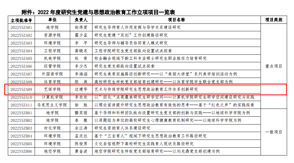 根据前期研究生院和党委组织部研究生党建与思想政治教育工作立项研究项目申报通知的要求,经专家小组评议、研究生院(党委研工部)、 党委组织部审定,2022 年度研究生党建与思想政治教育工作立项项目已经确定并下达,其中亚洲色吧 获批四项,包括一个重点项目,三个一般项目。