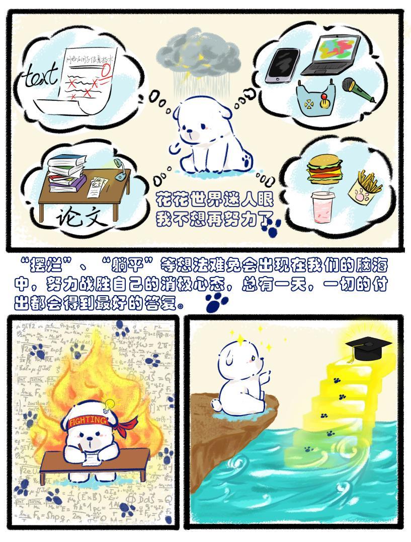 作者通过画笔绘出在大学生活中面对各种作业、论文、考试,我们难免会迷失自己,选择摆烂和躺平。我们应当想办法克服消极情绪,摆正心态,相信所有付出的努力,终会在未来的某一天得到回报。