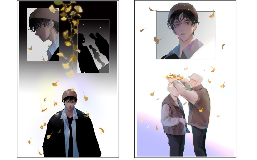 金色的漂亮落叶在主人公眼中也只是妨碍了视线,而他抬头时发现的一瞬间的美好让他意识到秋天是美丽的,一对老人相携着走过来满是情感的痕迹,他们有着自己的故事。有了希望和故事,事物顿时美好起来。