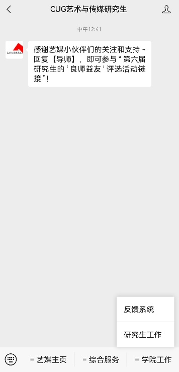 “CUG艺术与传媒研究生”公众号,进入公众号后台并点击右下方“学院工作”中的“反馈系统”,下滑至最底端可以扫码填写艺术与传媒权益调查问卷。