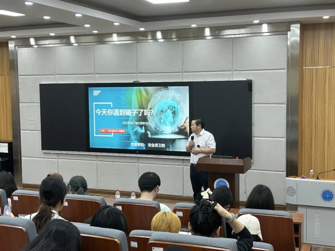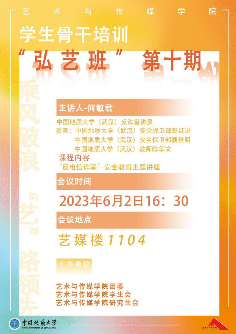 第十期“弘艺班”学生骨干培训在1104报告厅举行,学院研究生会和学生会的主要学生干部以及各班级学生代表参加了培训,本次安全教育培训的主题为《今天你遇到骗子了吗?——防范网络诈骗主题教育会》,由我校反诈宣讲员何敏君同学和安全保卫部魏景明、彭红进老师以及陈华文老师受邀讲解。
