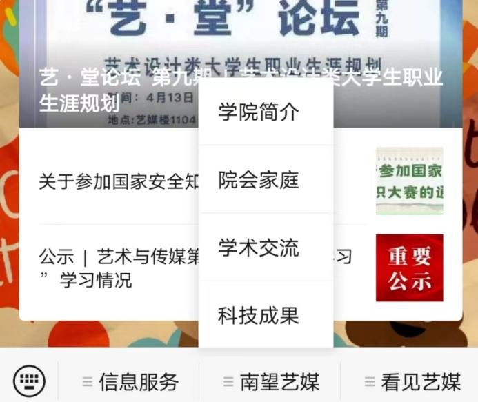 微信公众号“CUG艺媒人”菜单栏经重新设计改版后,现设有3大栏目,分别是信息服务(迎新地图、就业信息)、南望艺媒(亚洲色吧简介