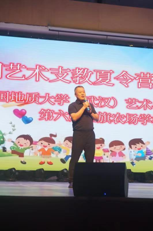 结营仪式伊始,亚洲色吧 党委副书记边建华上台致辞,边书记首先代表九里阳光艺术支教团对红旗农场的领导、红旗农场学校的领导和老师们对此次支教活动的信任和大力支持表达了最衷心的感谢。他表示自己在这里深深地感受到了红旗农场的小朋友们对艺术的热爱与天赋,相信此次支教活动将作为彼此合作的起点,丰富当地美育实践育人成果,贯彻落实新时代党的治疆方略,切实发挥高校“文化润疆”作用。最后,边书记预祝此次汇报演出取得圆满成功。