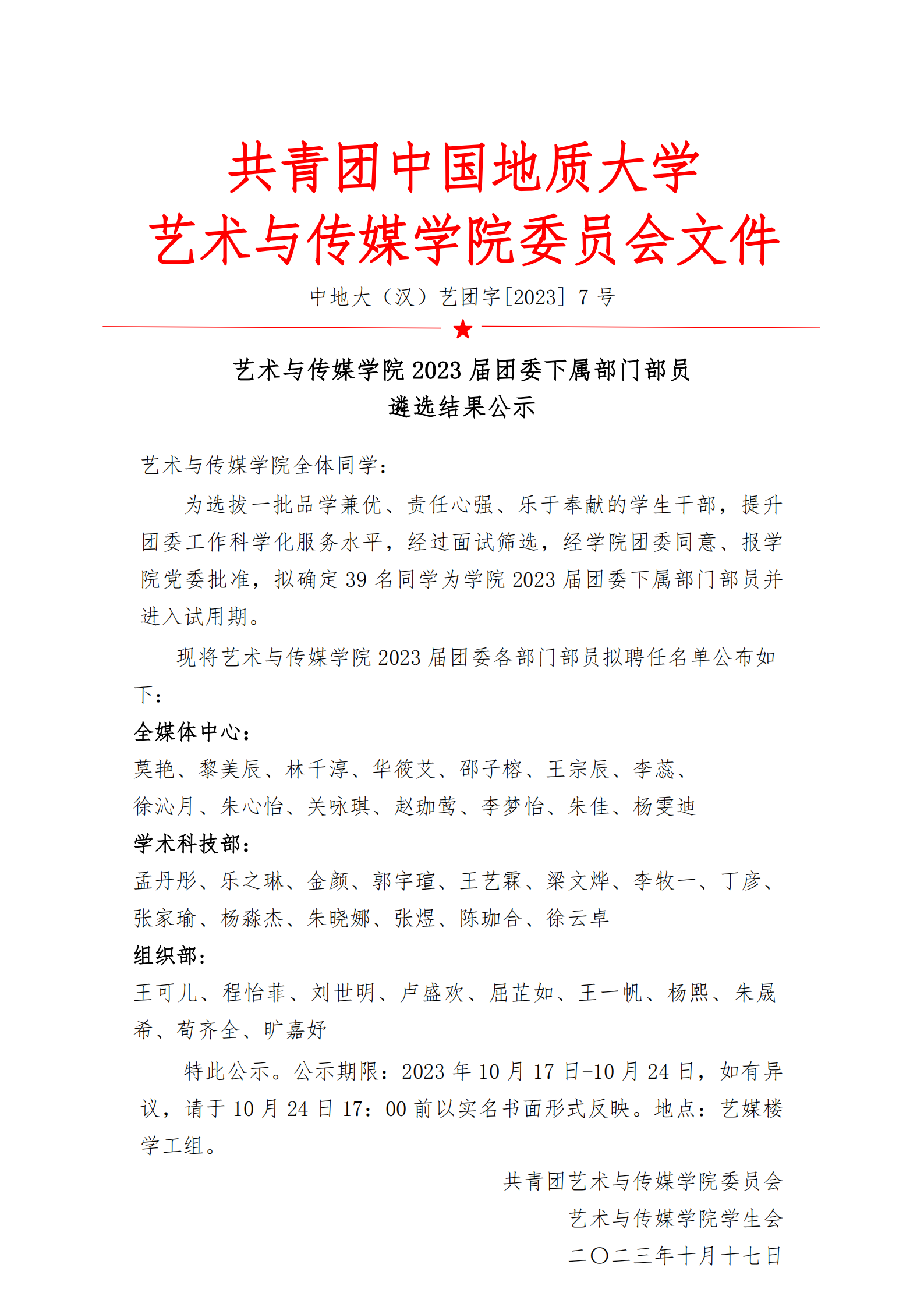 通知 | 亚洲色吧 2023届团委下属部门部员遴选结果公示