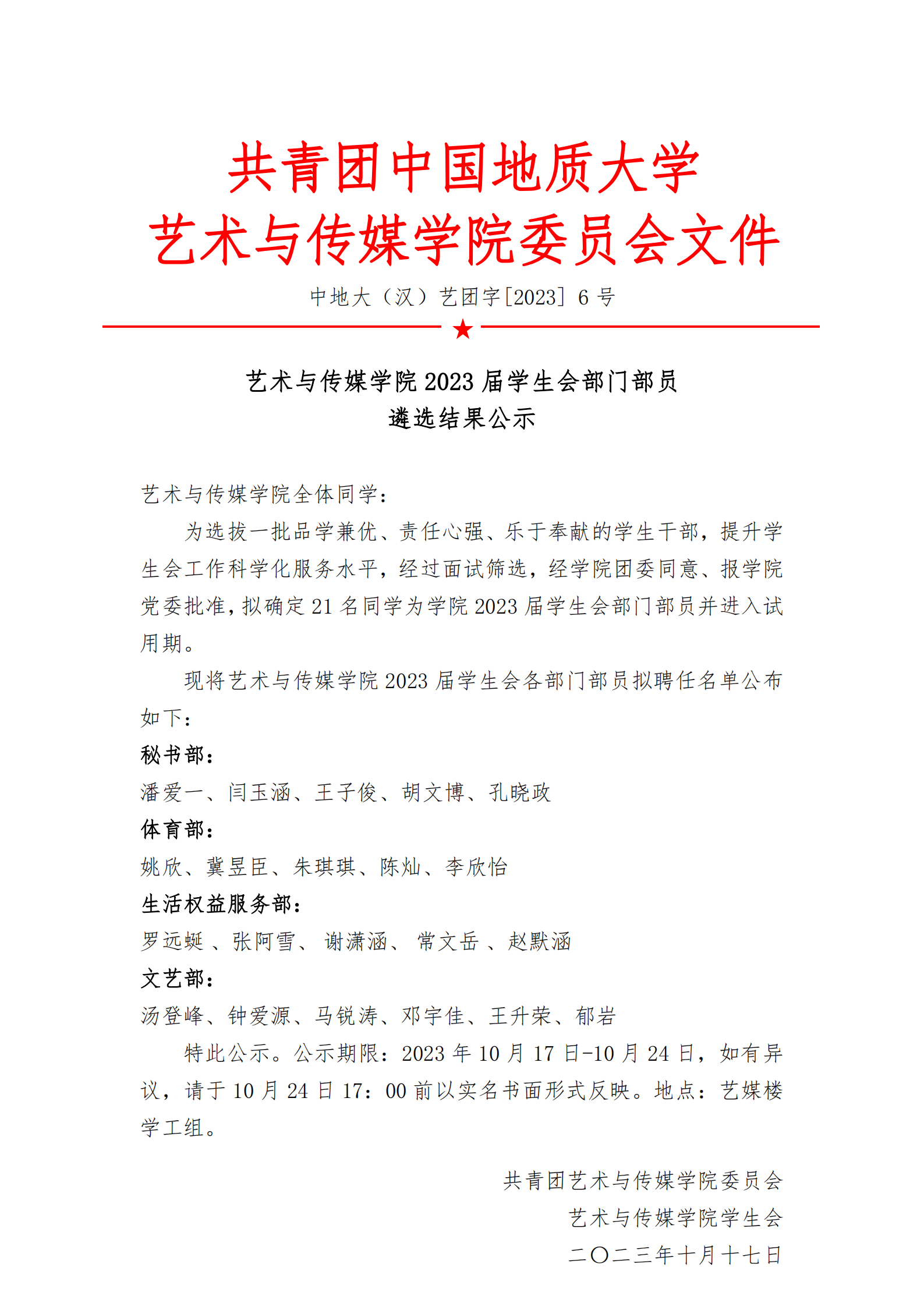 通知 | 亚洲色吧 2023届学生会部门部员遴选结果公示