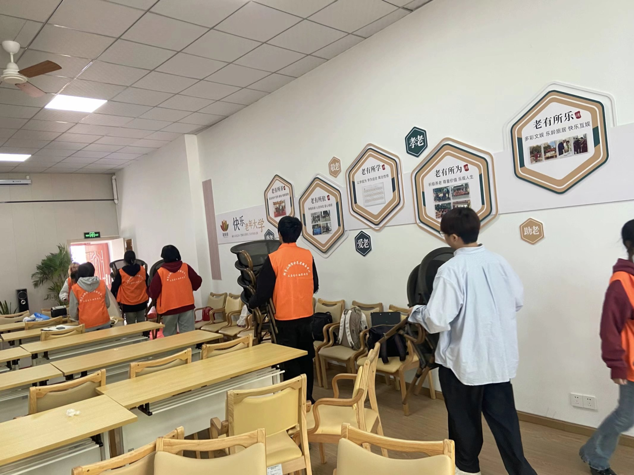 志愿者们于7:30准时出发,前往洪山区狮子山街道养老服务中心。抵达敬老院后,志愿者迅速开始布置活动场地,搀扶老人们入座,为即将展开的艺术活动做精心的准备。