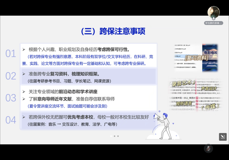 李怡静为同学们分享推免流程,帮助同学们提前做好长线规划,明确目标,然后从可行性、难易度以及加分项为同学们讲解跨专业保研的相关注意事项。