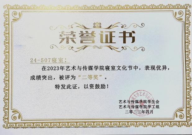 我班同学关心宿舍集体,友爱他人,积极配合学校的各项大小事务,贯彻劳动教育精神,纪律严明、态度端正,劳动热情高,劳动技能好,具有良好的精神风貌,劳动习惯和劳动品质。在去年本科生院组织的文明优秀宿舍评比中,我班有多间宿舍被评为校“文明宿舍”和“创意宿舍”称号。在上学期的文明联检中,我班506宿舍被评为优秀宿舍6次,504宿舍被评为优秀宿舍5次,507宿舍被评为优秀宿舍2次。其中506宿舍连续两年获评校“百佳宿舍”。我们始终以提高宿舍文化,以形成有特色的宿舍文明为目标而努力着。