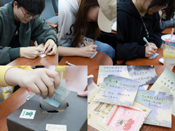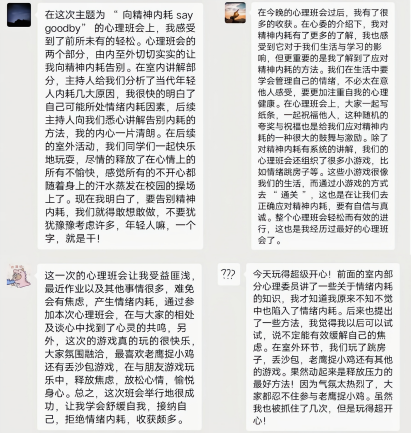 20人的大集体,爱意在日日的相处中生长。我们会在节日来临之际,互相在小纸条上写下对彼此的祝福,我们会一起玩童年游戏,回归最简单的快乐,我们还会一起哭一起笑……回首过去两年,问到想分享的事时,同舍的她说“感谢L在我不想早起的我给我带饭”;他说“感谢和你们相遇”,她说“感谢舍友们让506有干净整洁的环境”,他说“感谢T和X倾听我的烦恼”,她说“xy同学每天都悄悄起床,怕吵醒我”,他说“谢谢那些深夜安慰我的那个声音”……