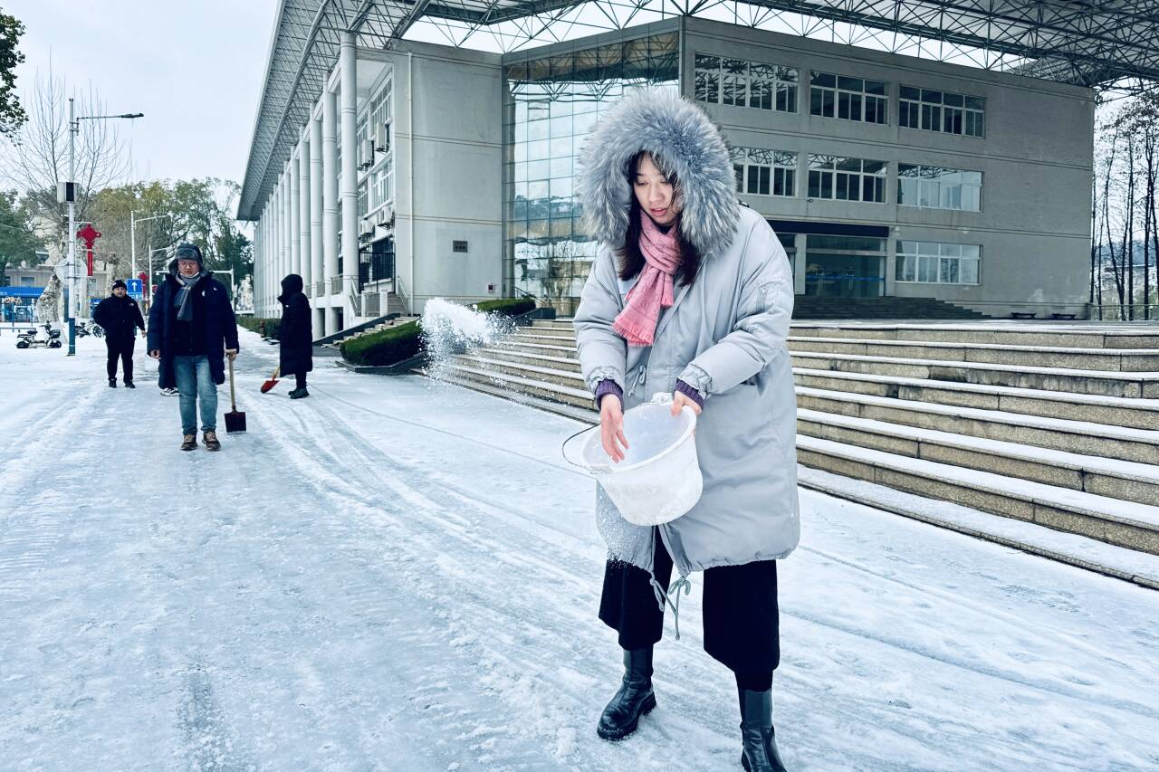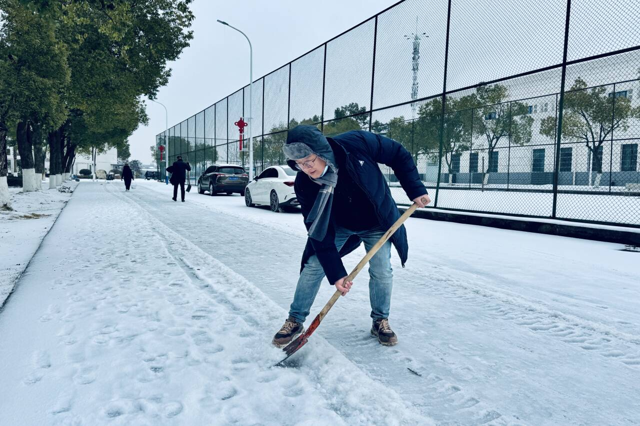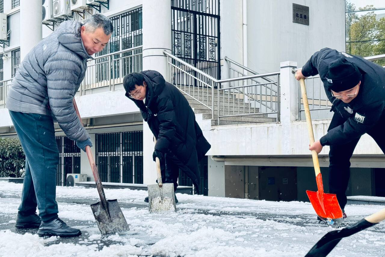 楼前的道路上和中庭里显露出来……同志们的劳动身影成为冰天雪地里的一道亮丽风景,老师们的辛勤付出只为迎接同学们平安归来。